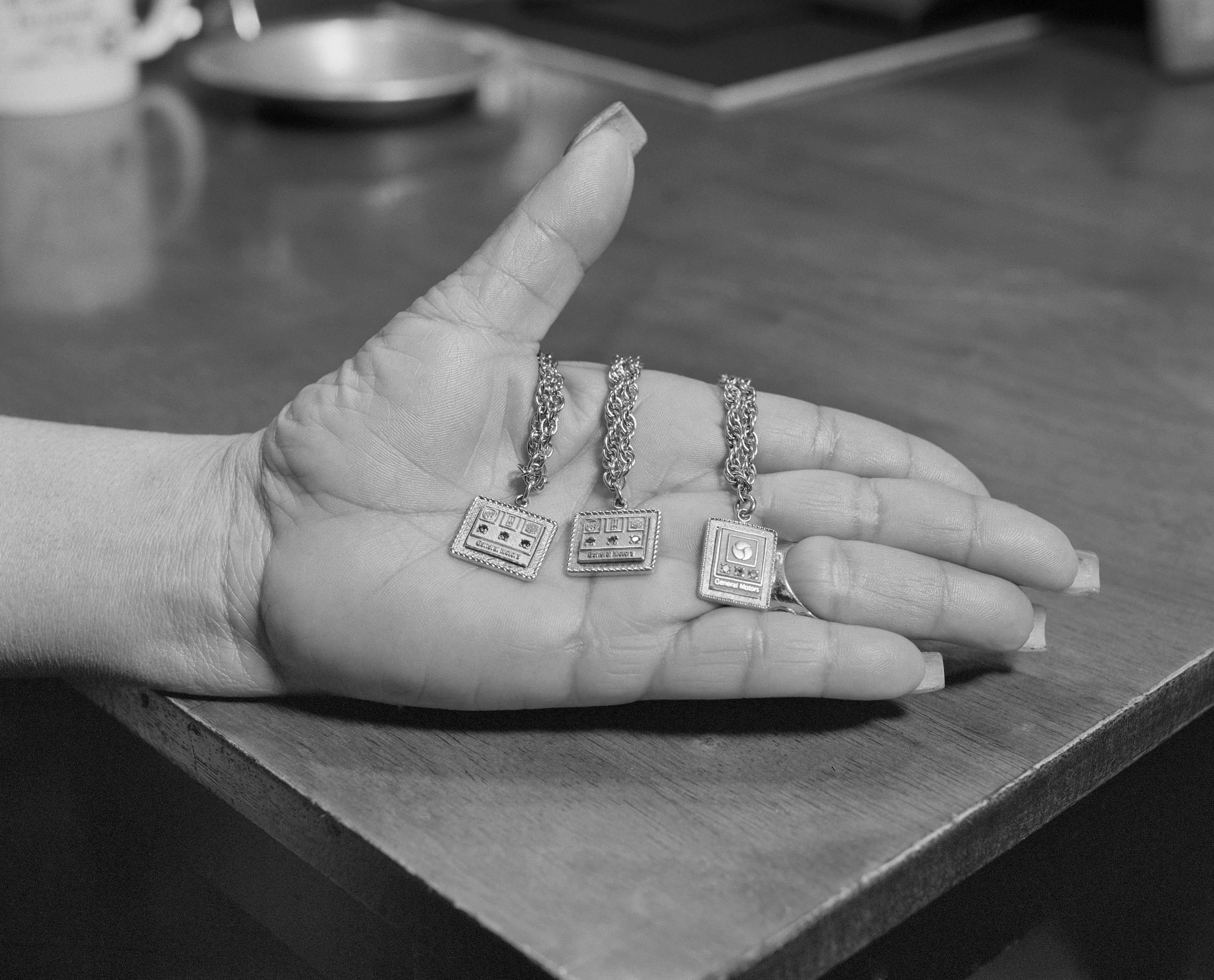 LaToya Ruby Frazier, Frances Turnage, UAW Local 1112, Women’s Committee, holding her 10, 15, and 20 years of service General Motors company anniversary gold bracelets in her dining room, (34 years in at GM Lordstown Complex, paint shop), Youngstown, OH, from The Last Cruze, 2019.