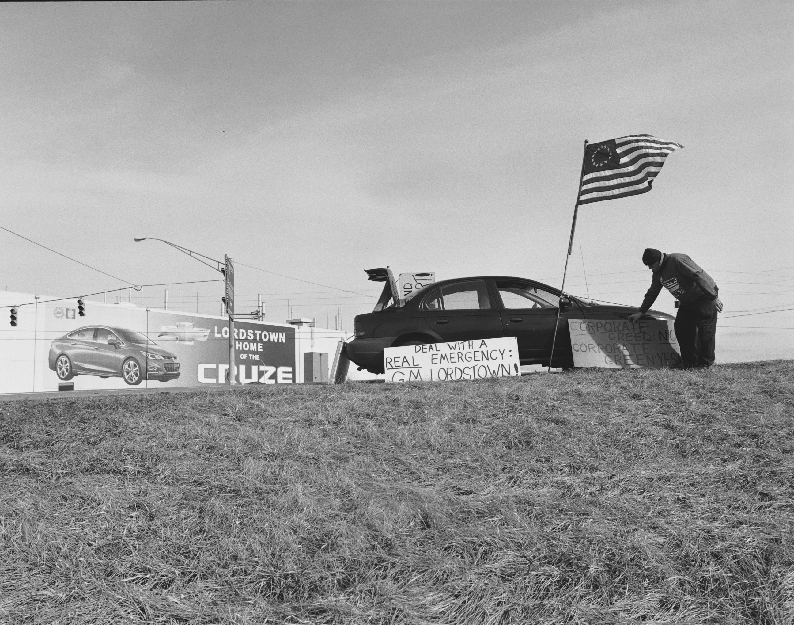 LaToya Ruby Frazier, Werner Lange, 45-day-vigil, standing at the intersection of Ellsworth Bailey Rd and I-80 Ohio Turnpike toll road entrance, Lordstown, OH, from The Last Cruze, 2019.