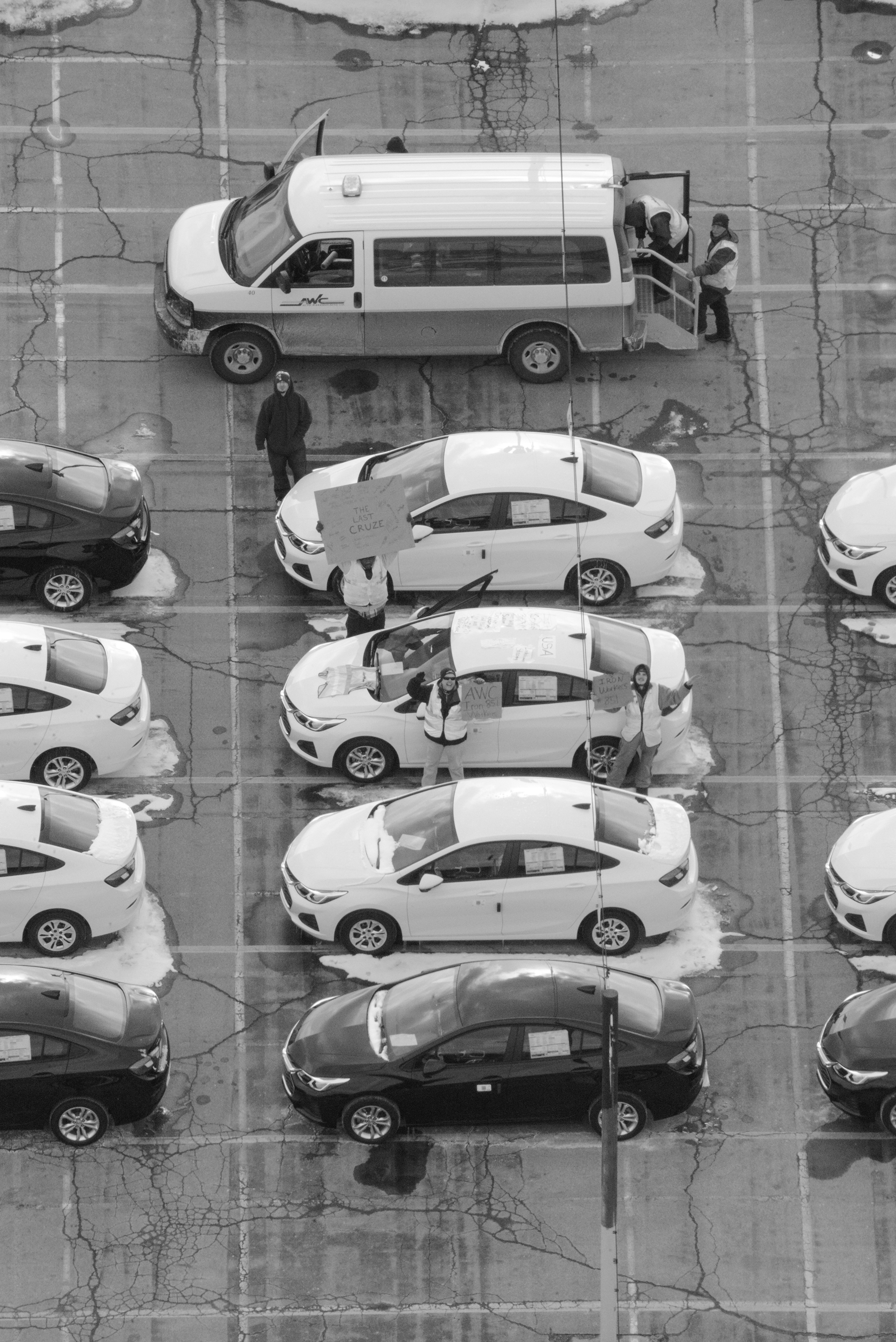 LaToya Ruby Frazier, Mindy Miller, Iron Workers Union Local 851, standing with fellow iron workers and the last Chevrolet Cruze compact sedan in the GM Lordstown Complex, (11 years in at Auto Warehouse Company (AWC)), Lordstown, OH, from The Last Cruze, 2019.