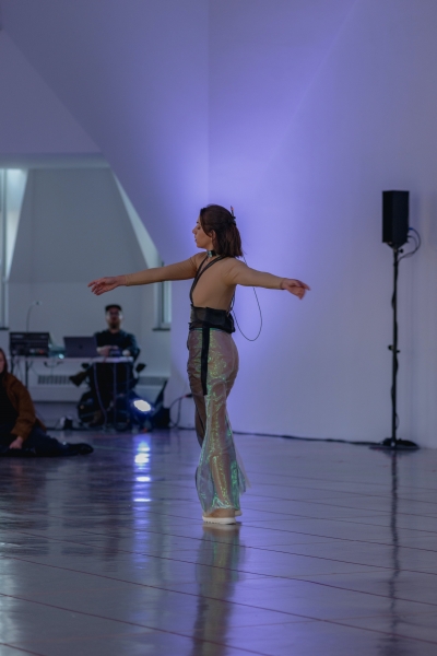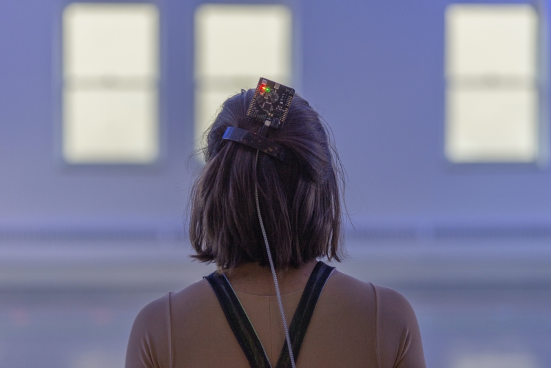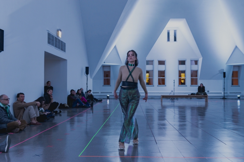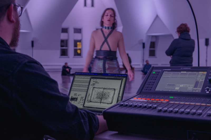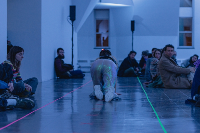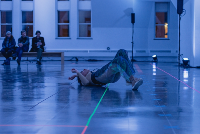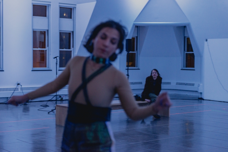 During each day’s three-hour performance, the gallery becomes a site of live experimentation as she explores what this spatialized digital set-up can do. Through her movement in the demarcated space, she gradually activates this system in compounding, and sometimes confounding, ways.