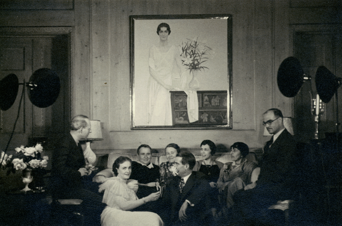 At the home of Bobsy and Barney Goodspeed: Gertrude Stein, Fanny Butcher, Alice Roullier, Alice B. Toklas (all on sofa); Barney Goodspeed (seated at left), Bobsy Goodspeed (with flower), Richard Bokum, Thornton Wilder (seated at right). Fanny Butcher Papers, Newberry Library.