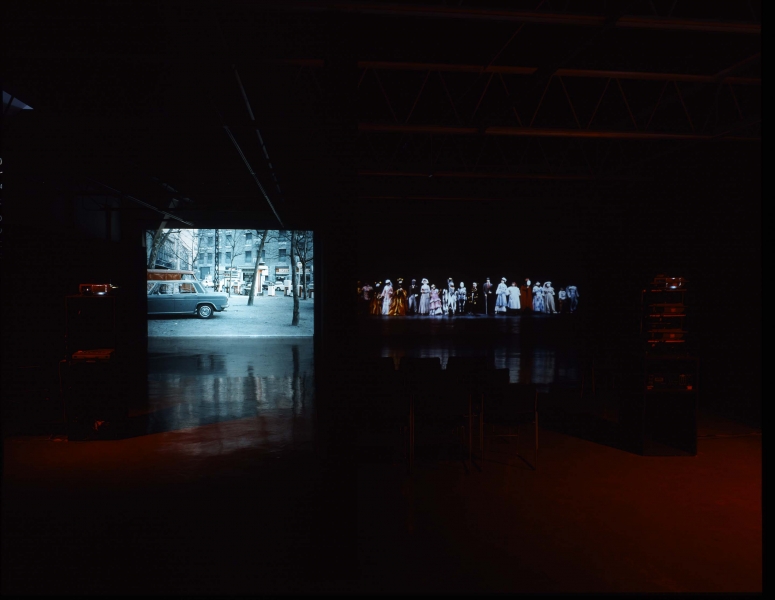 James Coleman, Installation View. Left: Slide Piece, 1973; Right: Living and Presumed Dead, 1983.