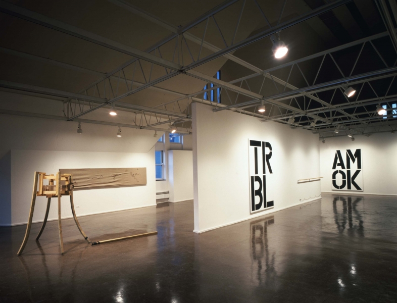 An exhibition of new work by German artists Georg Herold and Albert Oehlen and New York artist Christopher Wool. All three of these artists, to varying degrees, question the traditionally high status and meaning of art objects. These artists exaggerate and rely on Art’s preordainment to validate their absurdly symbolic and “expressive” works of art. Oehlen’s paintings, Herold’s sculptures, and Wool’s paintings share an irreverent attitude towards different yet equally high-minded and serious subjects and institutions: Oehlen’s concerns are the validity of any degree of Expressionism and the meaning of being “German”; Herold’s are the explanatory seduction of diagrams and their potential as political metaphor; and Wool’s are painting’s tradition as the primary artistic mode and act of communication and expression.