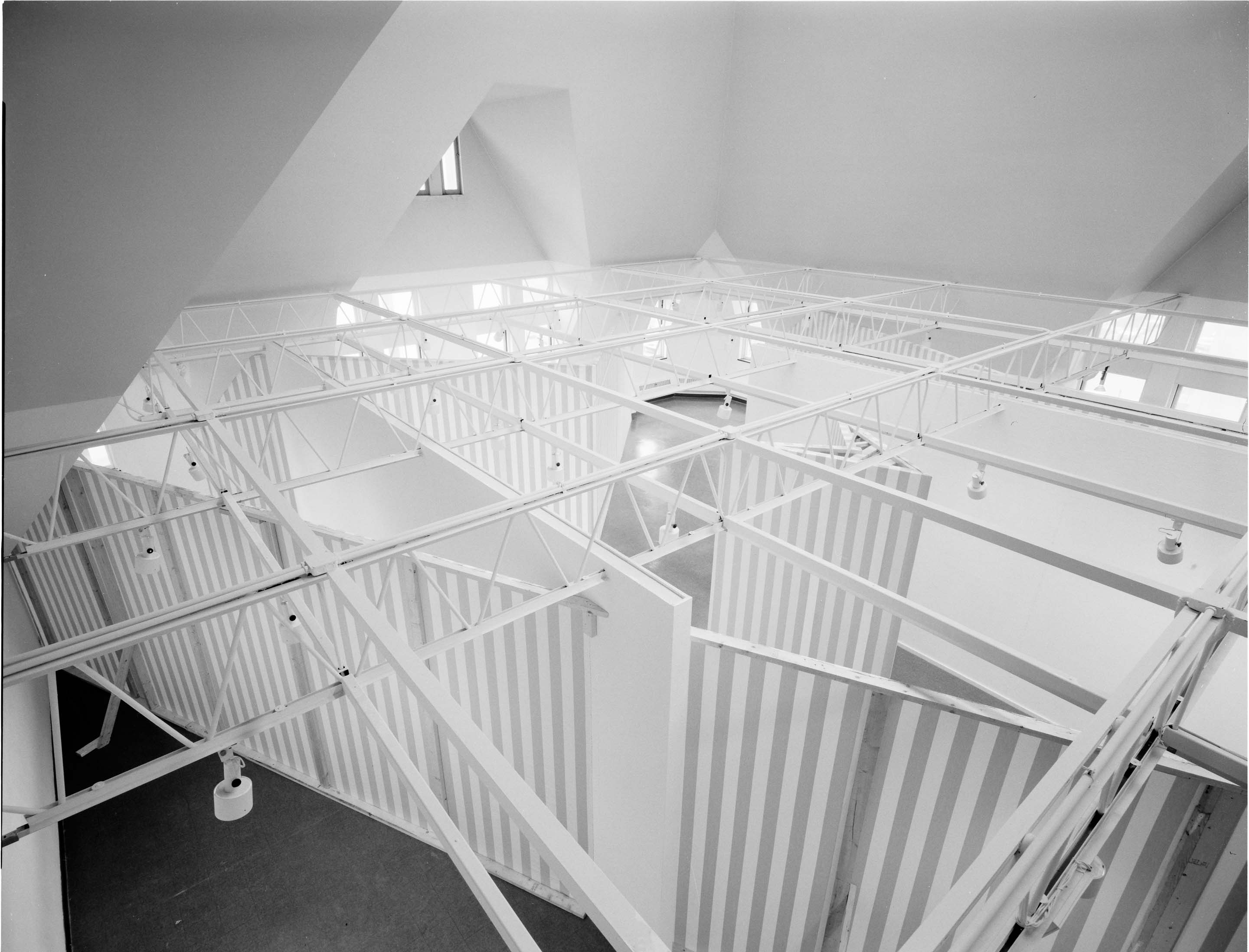 1983: Daniel Buren’s exhibition features striped fabric walls in the form of an “X”, highlighting discrepancy between the symmetry of the building’s footprint and the radical asymmetry of the gallery’s current floor plan.