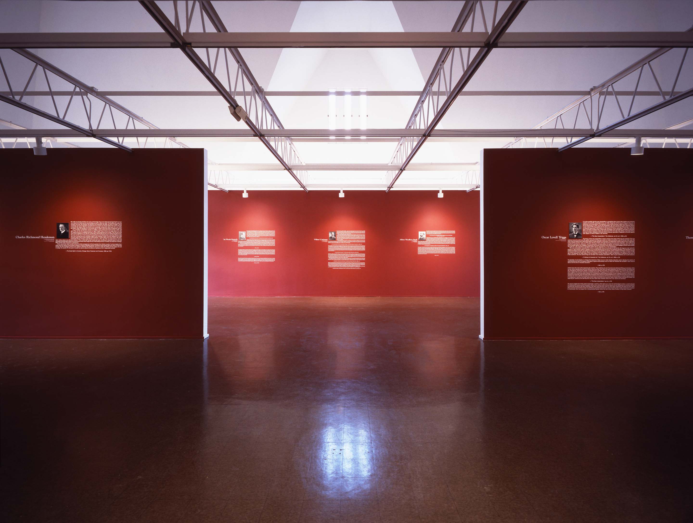 1990: Michael Asher exhibition uses recto/verso plan for walls; the fronts are painted maroon (the University of Chicago’s official color) and the backs are white with black stenciled patent numbers.
