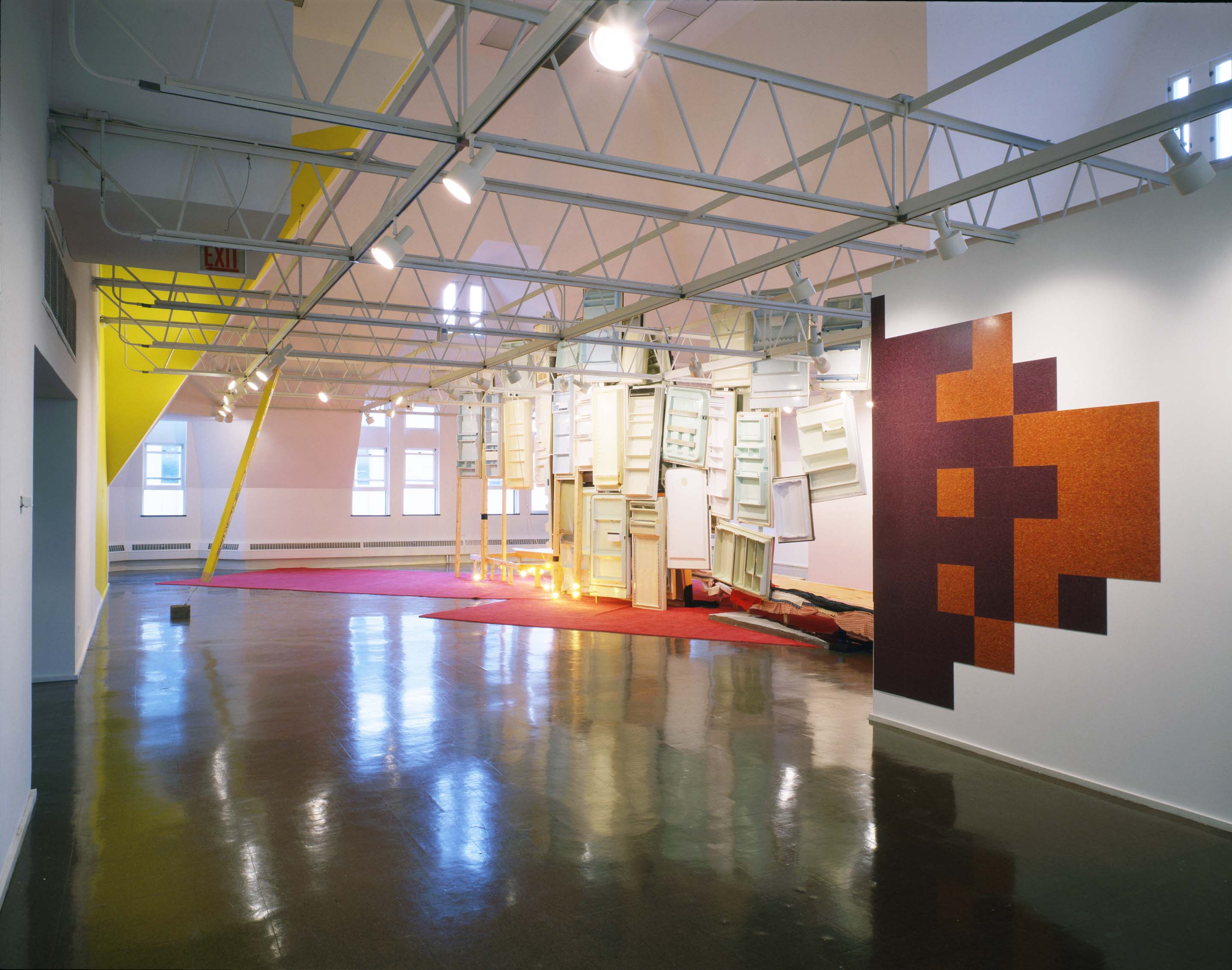 1994: One of the front walls is removed for Narelle Jubelin’s exhibition; the remaining front wall is removed for Felix Gonzalez-Torres’ exhibition, at which point regular reconfiguration of the gallery walls tailored to the exhibitions begins; the standard wall height drops a few inches to bottom of grid to reduce labor.