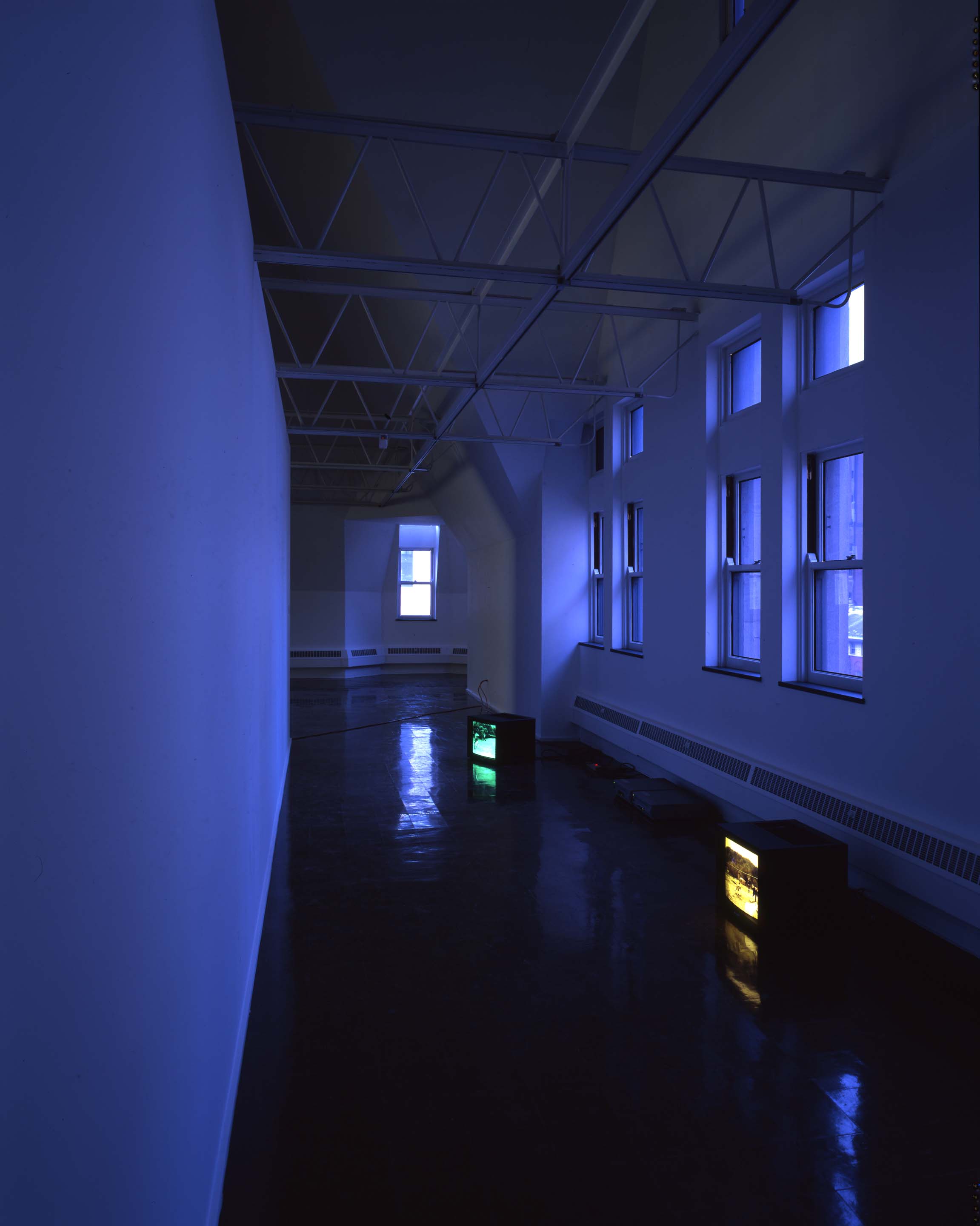 1995: The gallery is darkened for Diana Thater; covering windows with tinted film becomes part of installation repertoire as an increasing number of artists work with moving images.