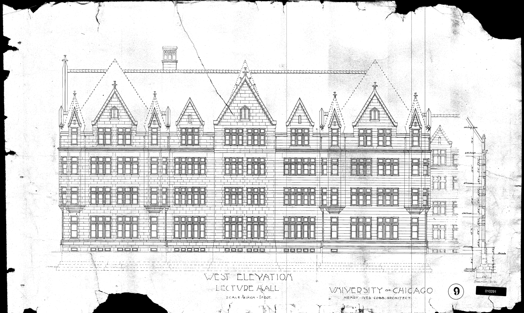 1892: Cobb Hall is completed; floor plans for 2nd, 3rd, and 4th floors are nearly identical; the current gallery, like the north end of the 2nd and 3rd floors, is divided into five spaces that consist of a central library with two lecture halls to either side; the 4th floor has a ceiling at 12′ 6″ (6″ above where the grid was positioned) and the 5th floor was unfinished attic space.