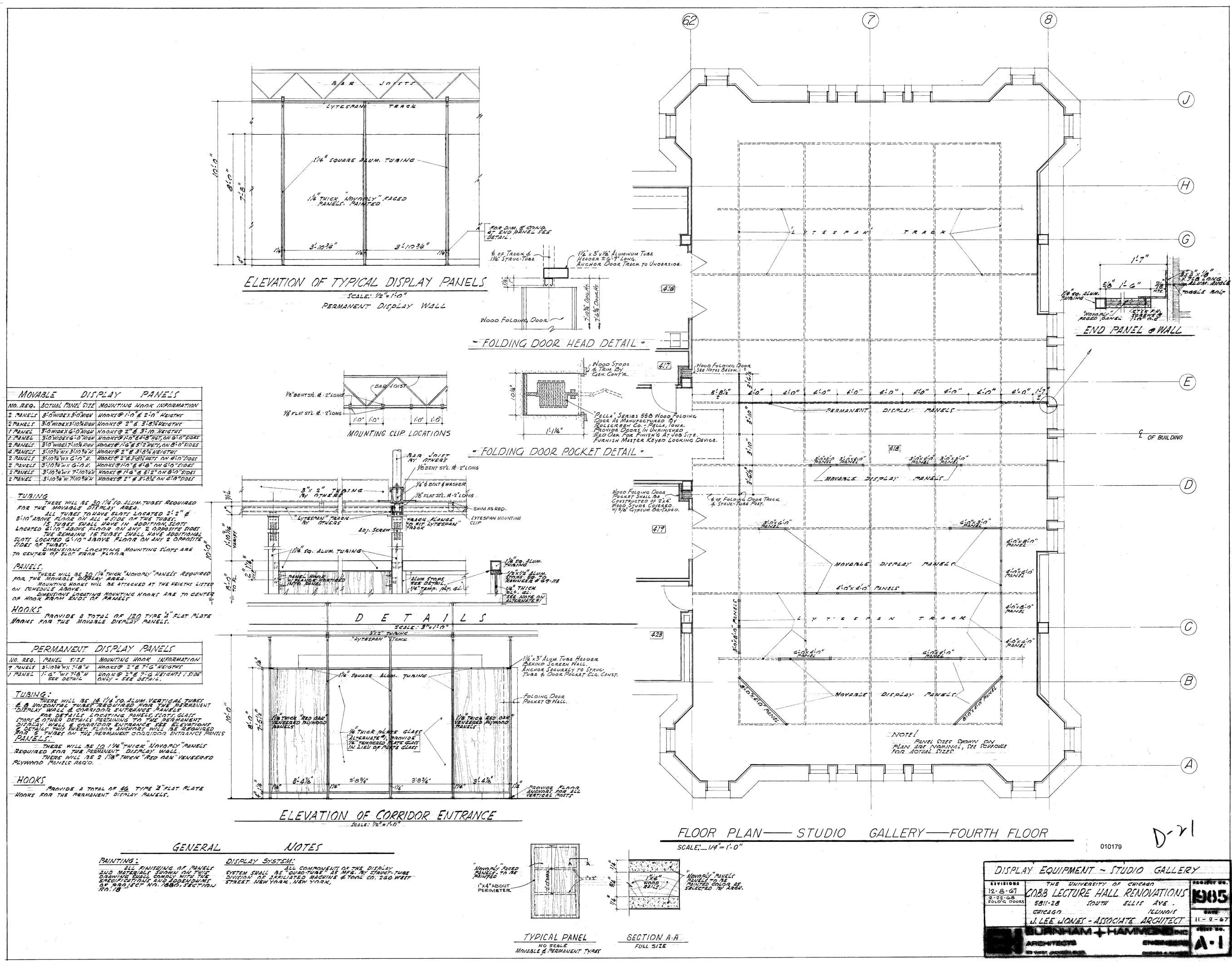 The steel trusswork, or “grid,” is installed in the gallery; it is a custom job designed by architectural firm Burnham and Hammond with James Lee Jones, the University architect; it accommodates a Lytespan track lighting system, a series of permanent and movable display panels, and folding doors that allow for opening and closing different parts of the gallery; a small balcony extending from new 5th floor offices overlook the gallery.