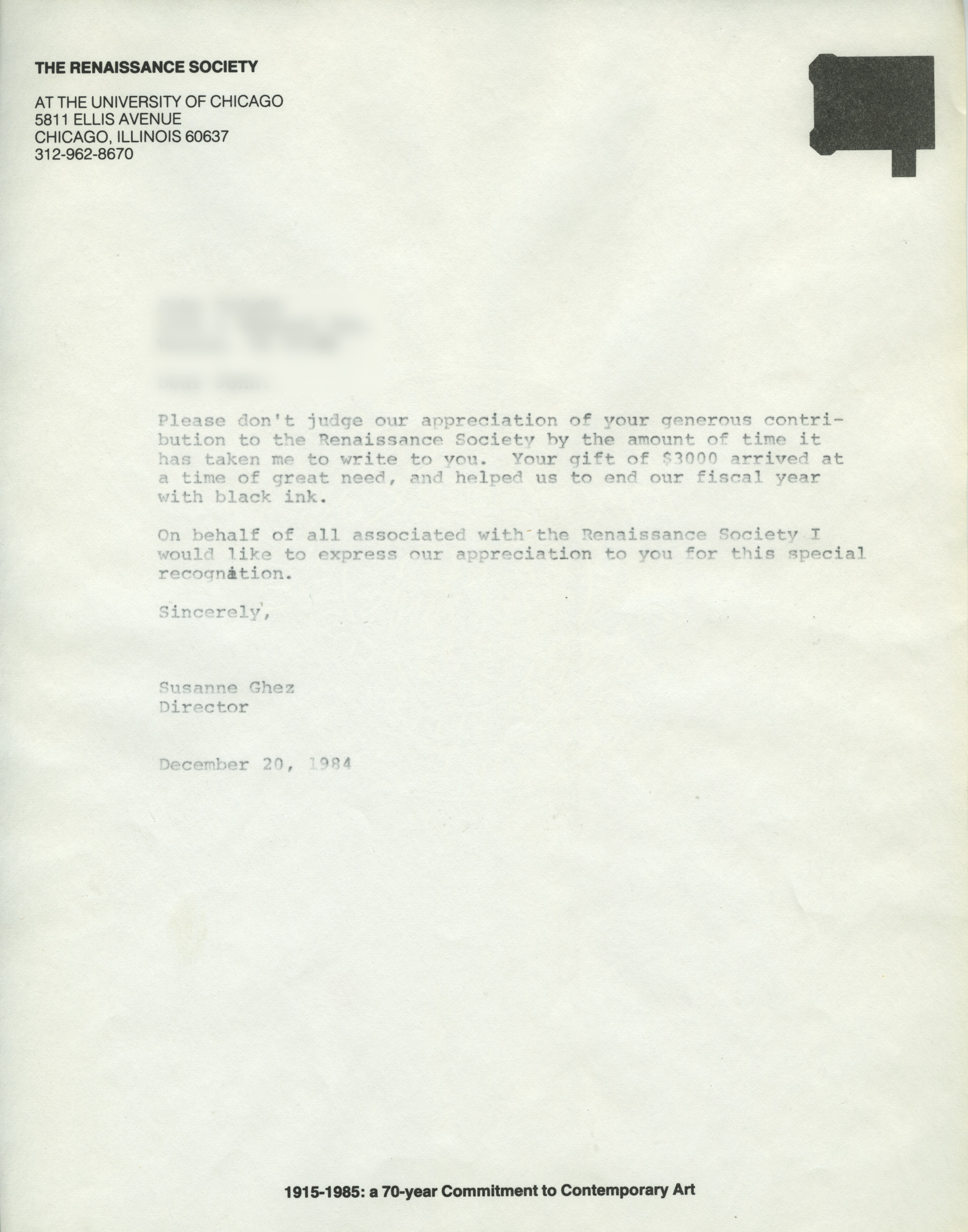 Renaissance Society letterhead, 1984