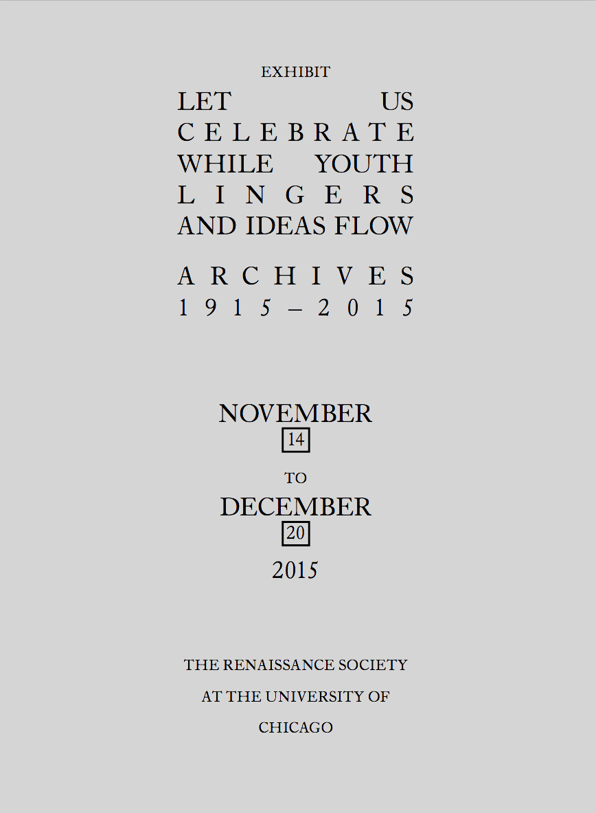 Exhibition and program booklet for Let Us Celebrate While Youth Lingers and Ideas Flow, Archives 1915-2015, an exhibition across four sites featuring historical materials and artworks by Michel Auder, Julia Fish, Gaylen Gerber, Felix Gonzalez-Torres, Rodney Graham, Miyoko Ito, Helen Mirra, William Pope.L, and Yutaka Sone