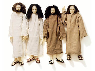 Kim Dingle Jesus Rag Dolls from My Struggles with Jesus, 1995 beeswax, cotton fabric, mohair, leather, raw cotton, oil paint, glass, plastic four dolls, each approx. 30” high Courtesy of artist and Blum & Poe, Santa Monica