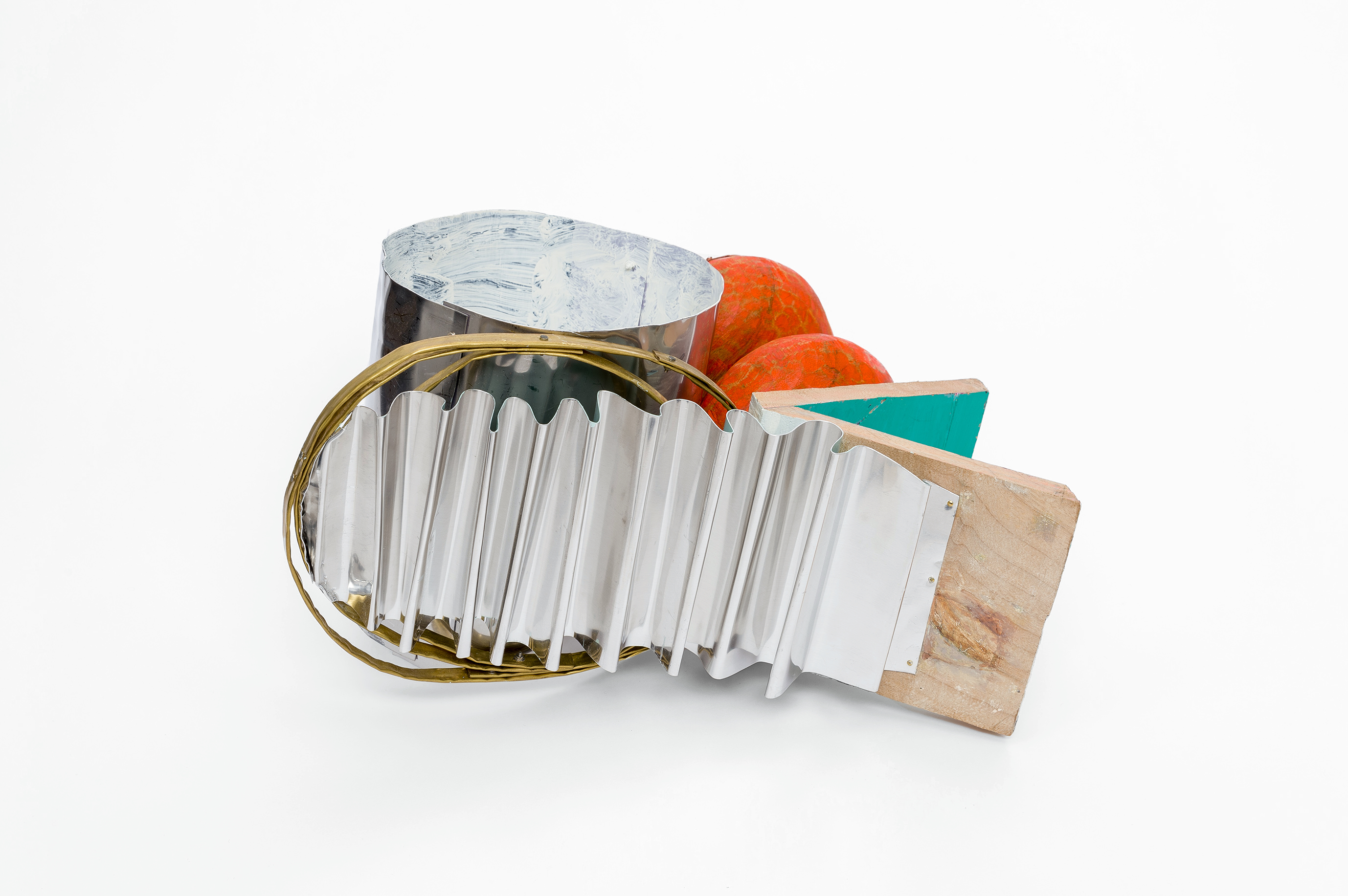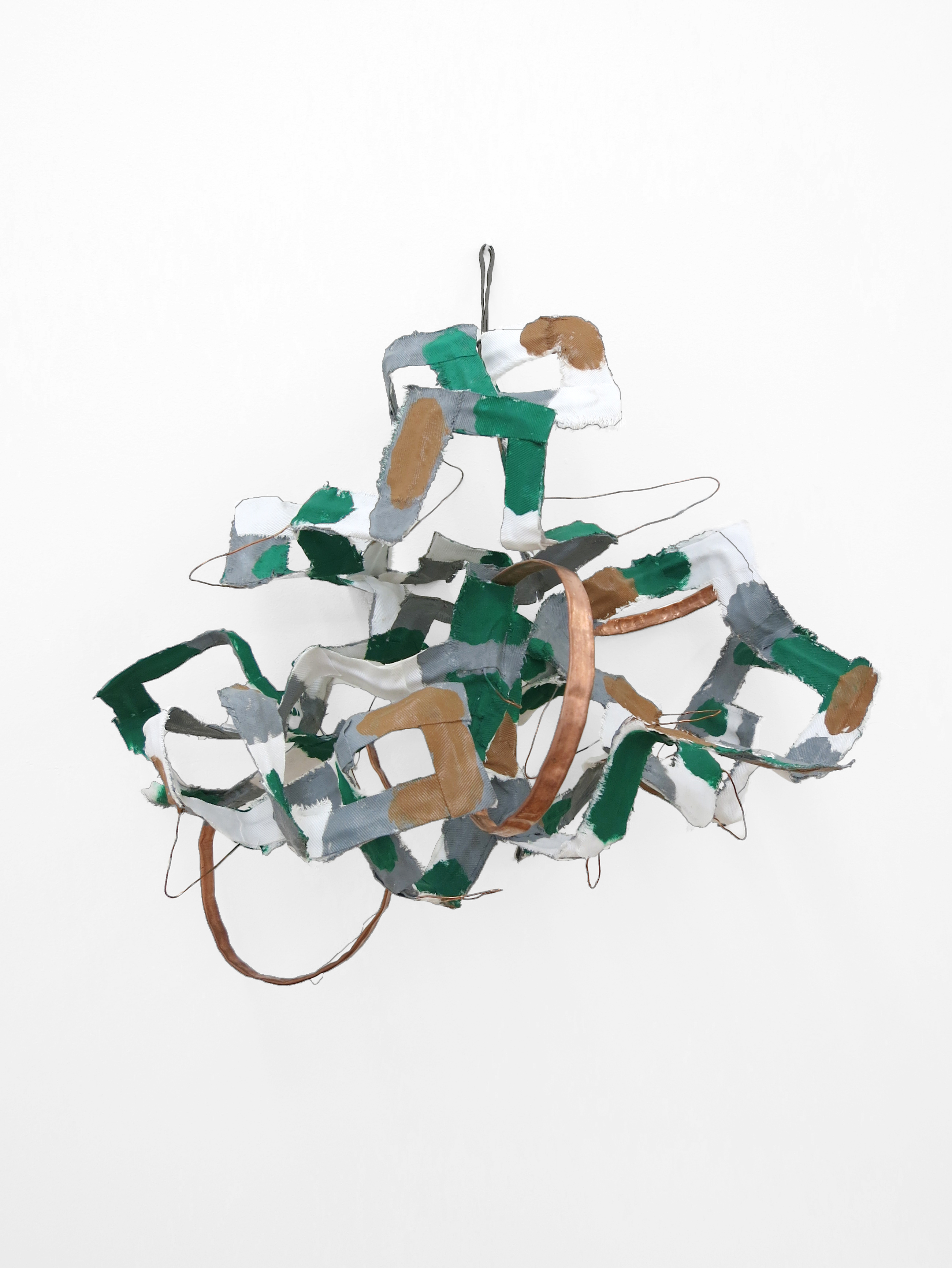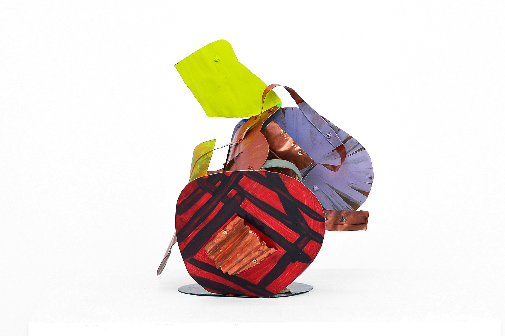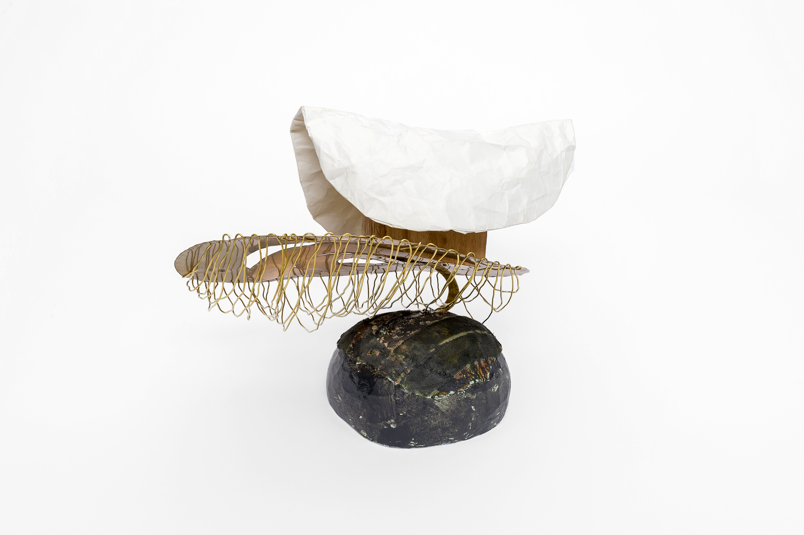 Miho Dohi uses materials such as yarn, wire, fabric, sheet metal, paint, and tape to create what she describes simply as buttai, or objects. Compact and complex, each buttai brings together an idiosyncratic constellation of shapes and surfaces, conjoined in subtle or playful juxtapositions.