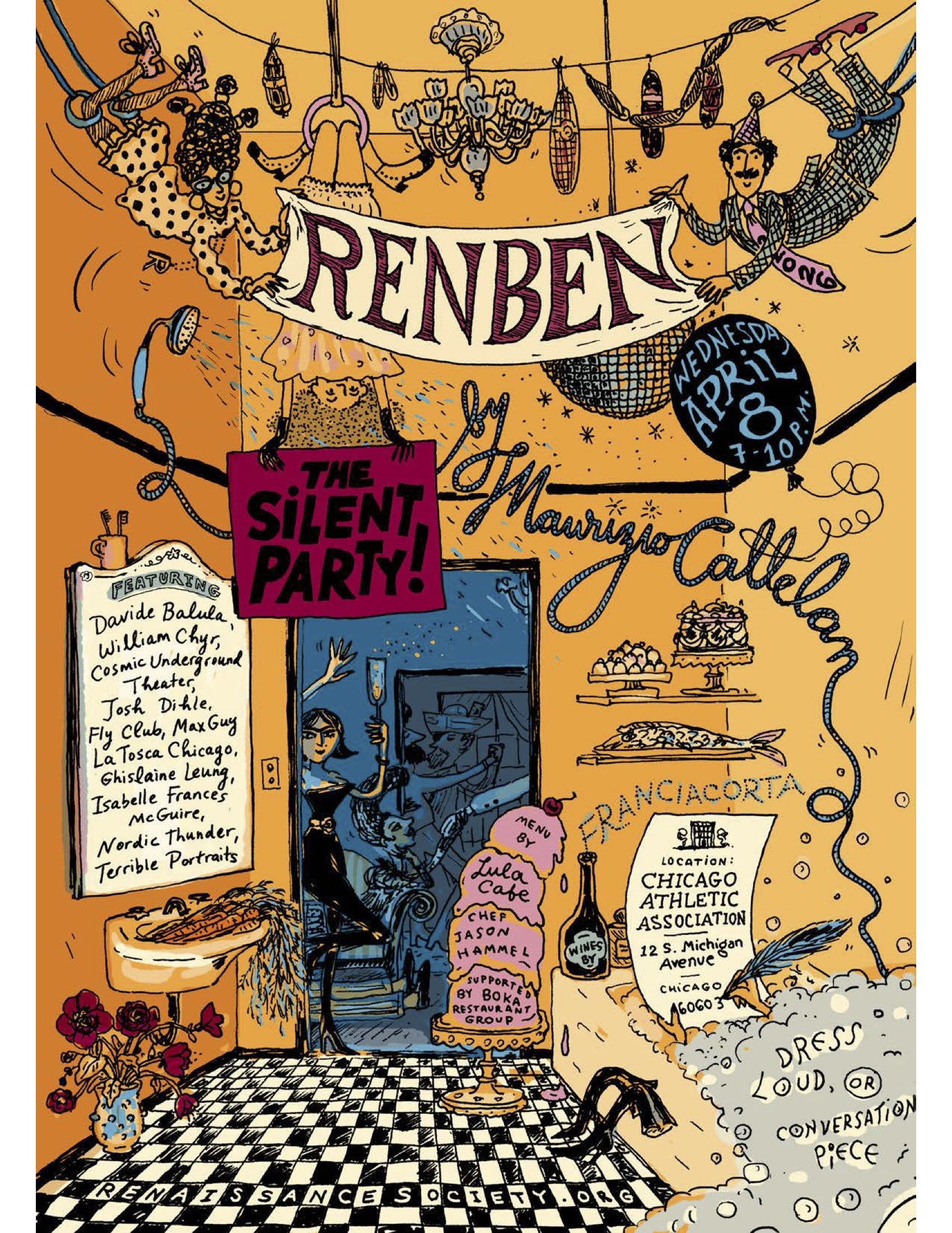 RenBen 2026 is shaped by the vision of Maurizio Cattelan. Known for his subversive wit, conceptual audacity, and ability to surprise, Cattelan is the latest artist to lead the Renaissance Society’s tradition of artist-conceived galas, following the bold editions by Piero Golia (2022), Adam Linder (2023), Kevin Beasley (2024), and Meriem Bennani (2025). This year, Cattelan’s “Silent Party” will transform two floors of the historic Chicago Athletic Association into a labyrinth.