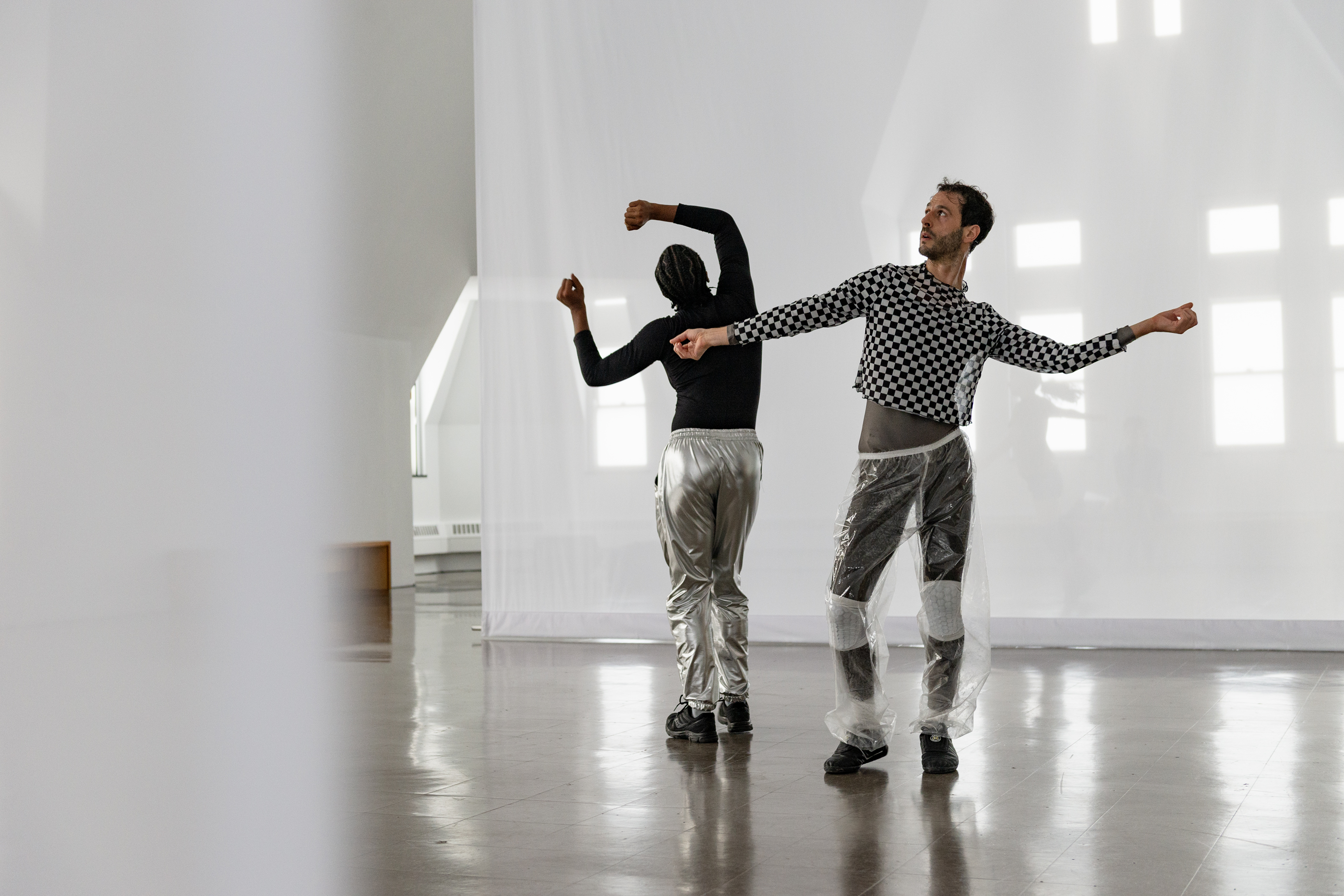Through her scored performance structures and a set of scenographic interventions created specifically for this space, Evans invites an active state of perception—grounded in one’s body and attuned to a larger milieu and social infrastructures—along with hints of reverie where things do and don’t make sense. In the vaulted gallery, she is composing with both material and immaterial ingredients: hanging scrims, enveloping sound, dancers in motion and in stillness, lines of sight, textures of light, and a public that stays or passes through. Dance, here, is both fleeting and visceral, evoking bodies at once fragile and forceful. Evans aims to create a setting for Scrimmage that has a related set of wavering qualities: heavy and light, monumental and ethereal. In doing so, she considers the frame and the format in tandem, the contents of her work and its container, the body and what’s beyond it.