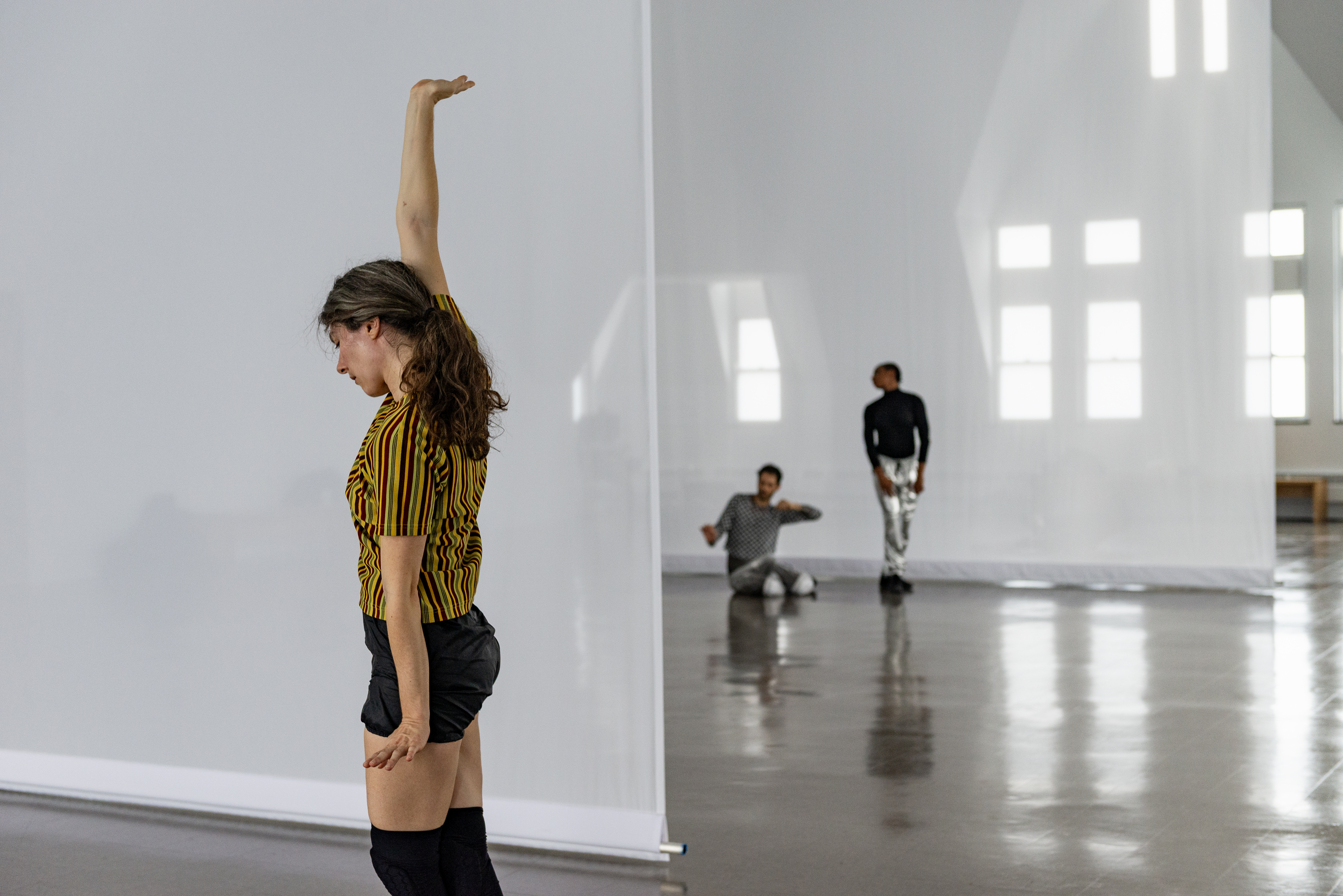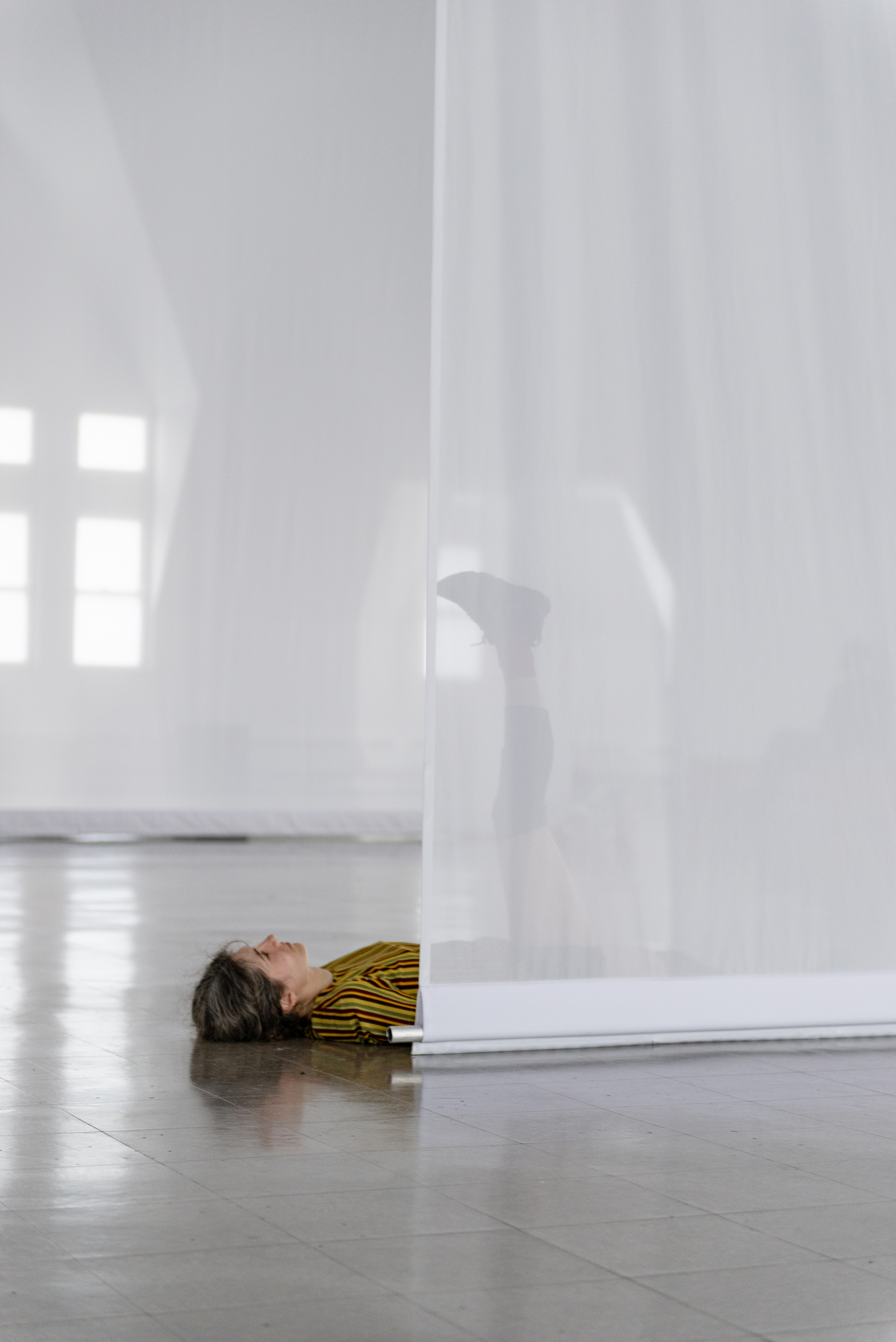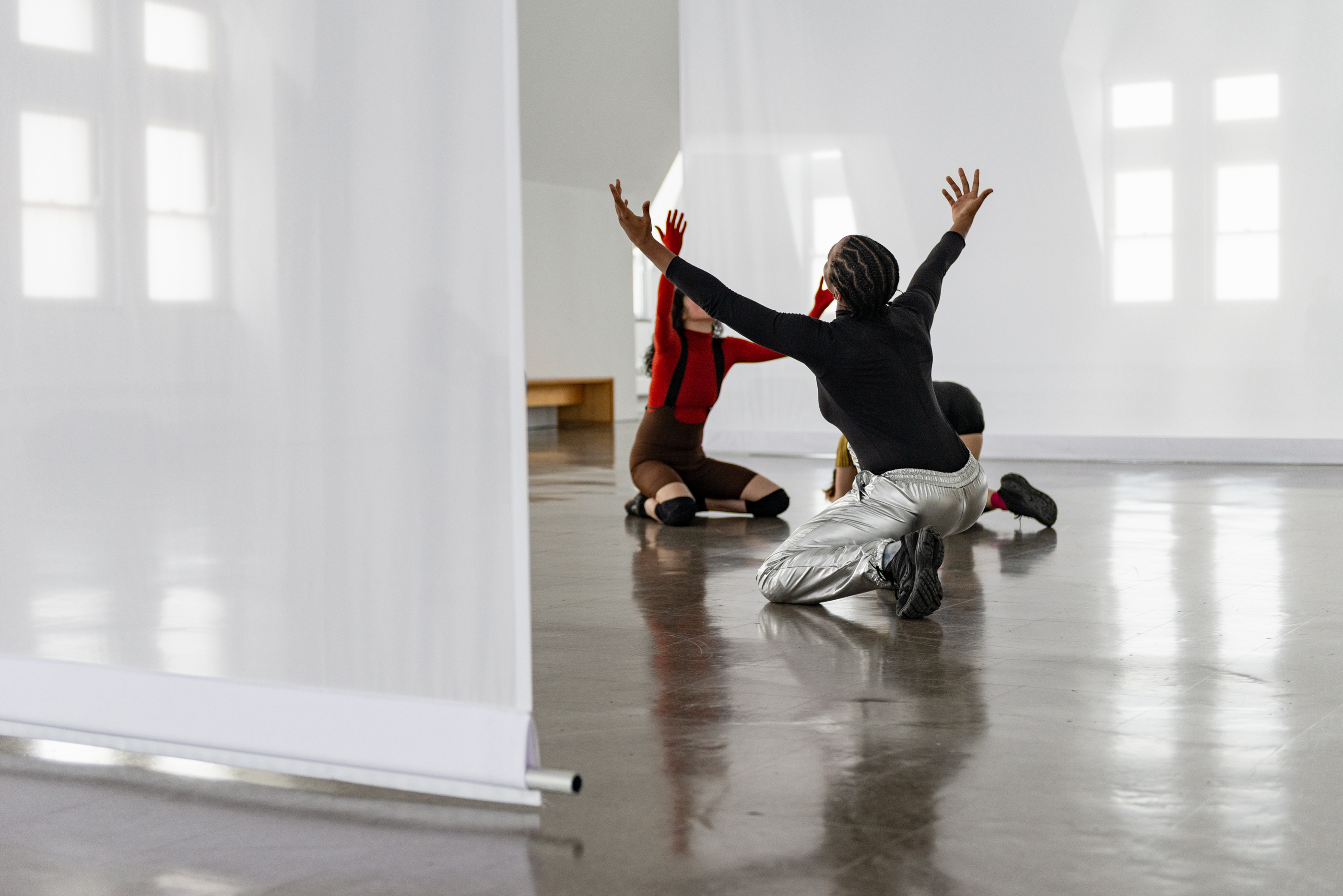 Through her scored performance structures and a set of scenographic interventions created specifically for this space, Evans invites an active state of perception—grounded in one’s body and attuned to a larger milieu and social infrastructures—along with hints of reverie where things do and don’t make sense. In the vaulted gallery, she is composing with both material and immaterial ingredients: hanging scrims, enveloping sound, dancers in motion and in stillness, lines of sight, textures of light, and a public that stays or passes through. Dance, here, is both fleeting and visceral, evoking bodies at once fragile and forceful. Evans aims to create a setting for Scrimmage that has a related set of wavering qualities: heavy and light, monumental and ethereal. In doing so, she considers the frame and the format in tandem, the contents of her work and its container, the body and what’s beyond it.