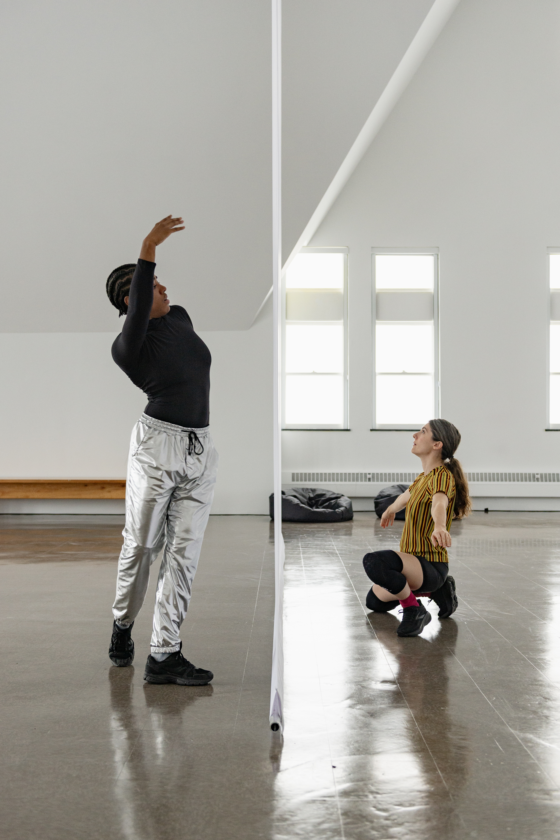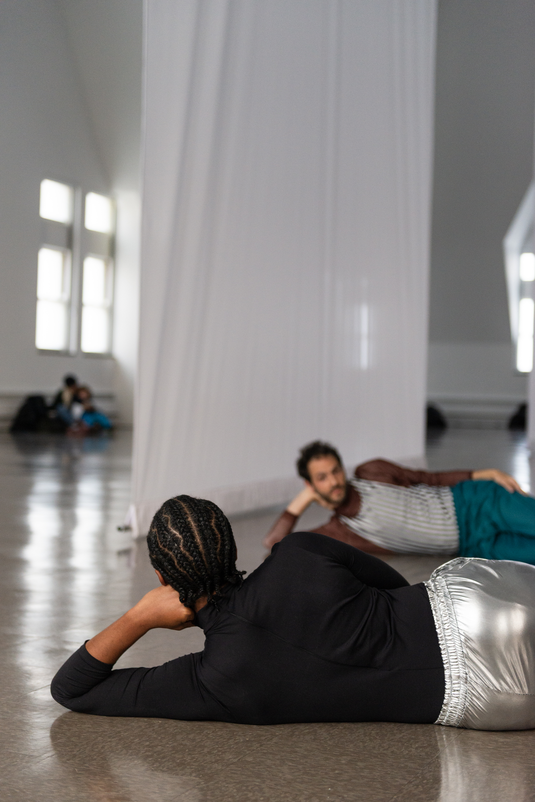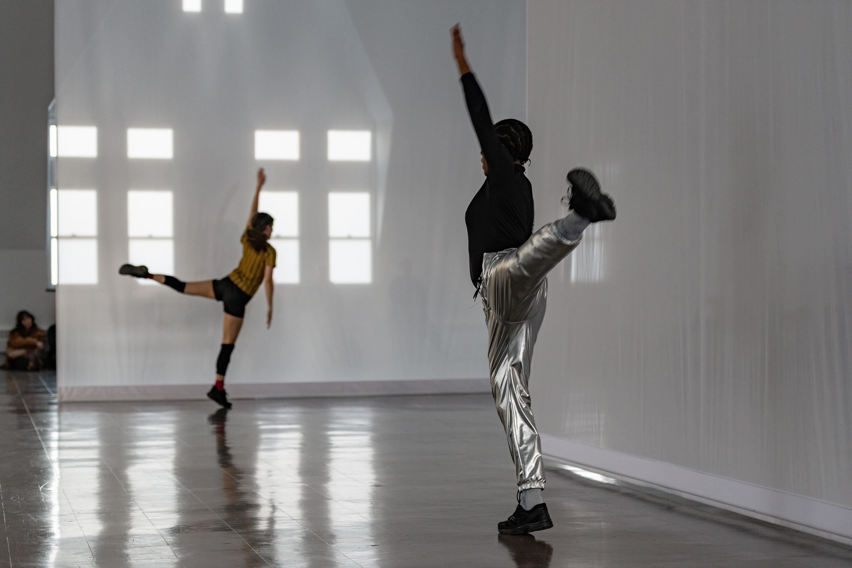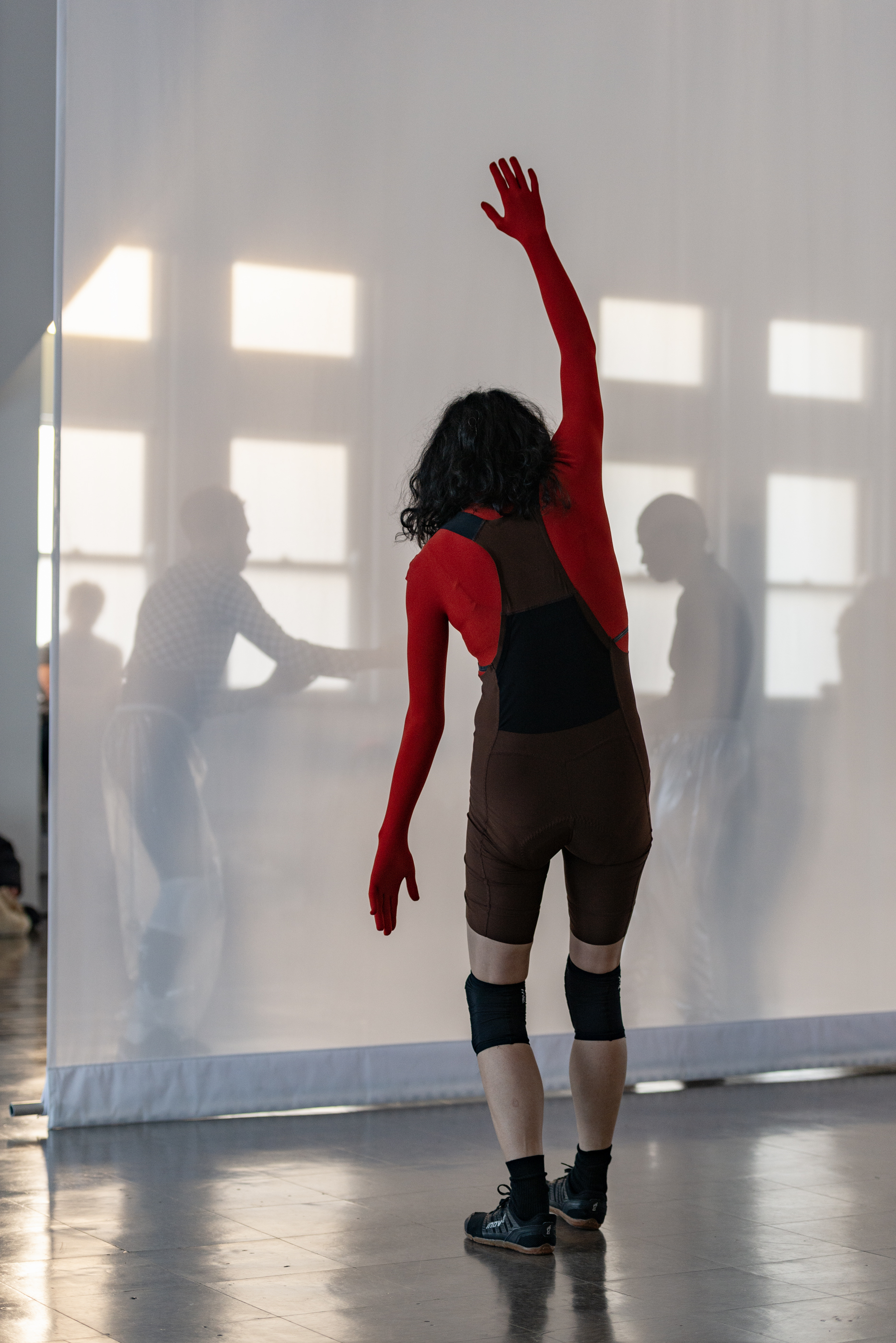 Through her scored performance structures and a set of scenographic interventions created specifically for this space, Evans invites an active state of perception—grounded in one’s body and attuned to a larger milieu and social infrastructures—along with hints of reverie where things do and don’t make sense. In the vaulted gallery, she is composing with both material and immaterial ingredients: hanging scrims, enveloping sound, dancers in motion and in stillness, lines of sight, textures of light, and a public that stays or passes through. Dance, here, is both fleeting and visceral, evoking bodies at once fragile and forceful. Evans aims to create a setting for Scrimmage that has a related set of wavering qualities: heavy and light, monumental and ethereal. In doing so, she considers the frame and the format in tandem, the contents of her work and its container, the body and what’s beyond it.