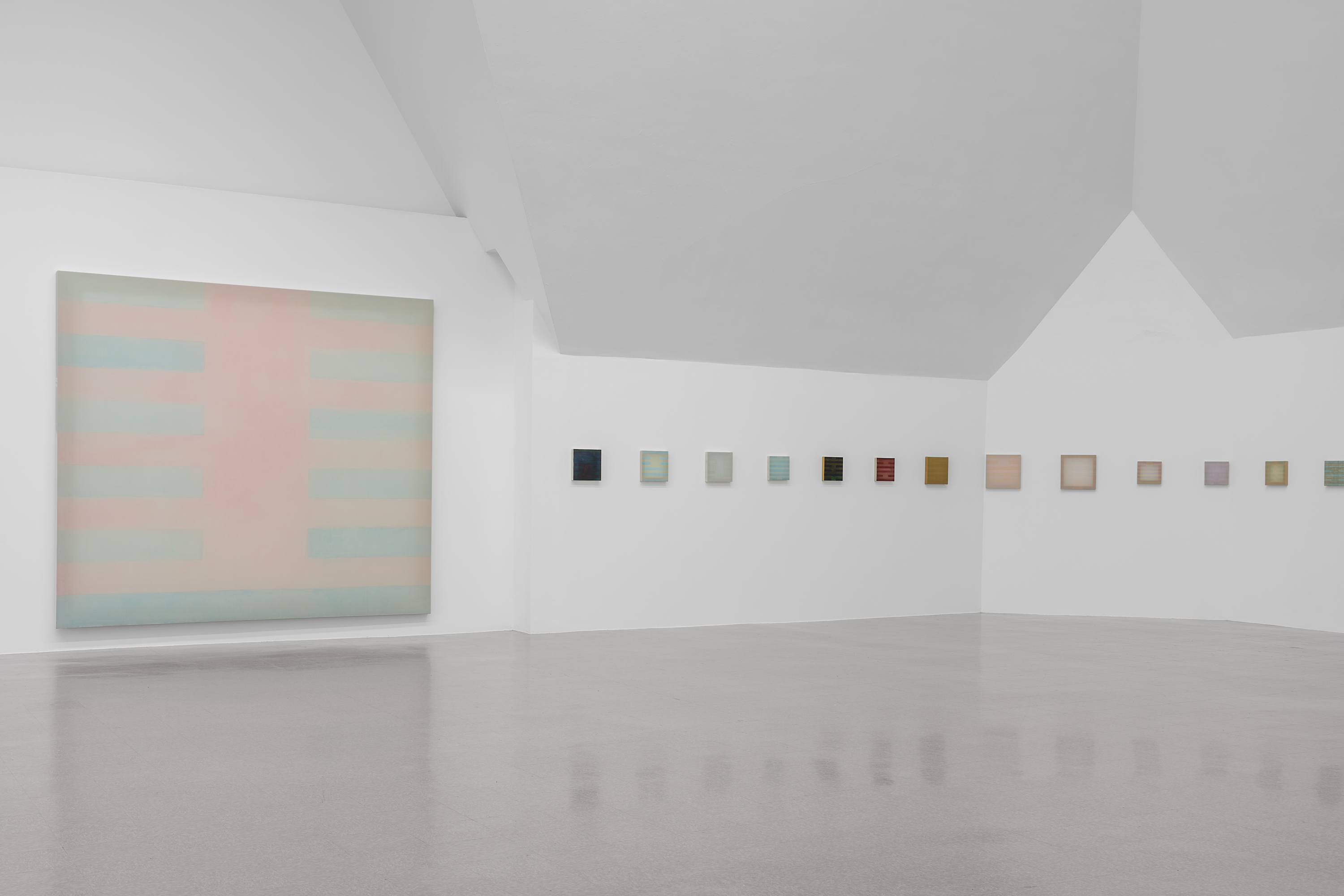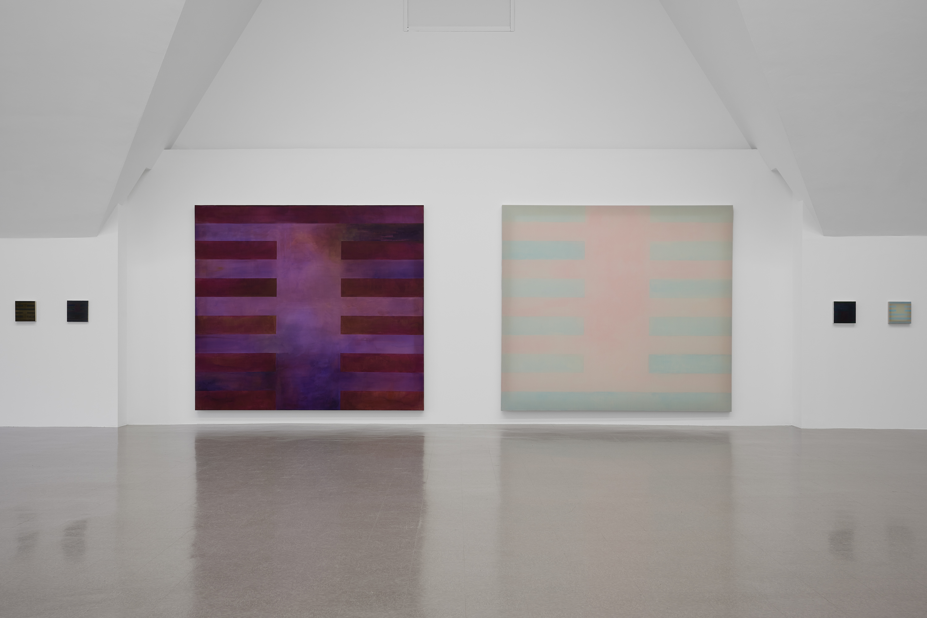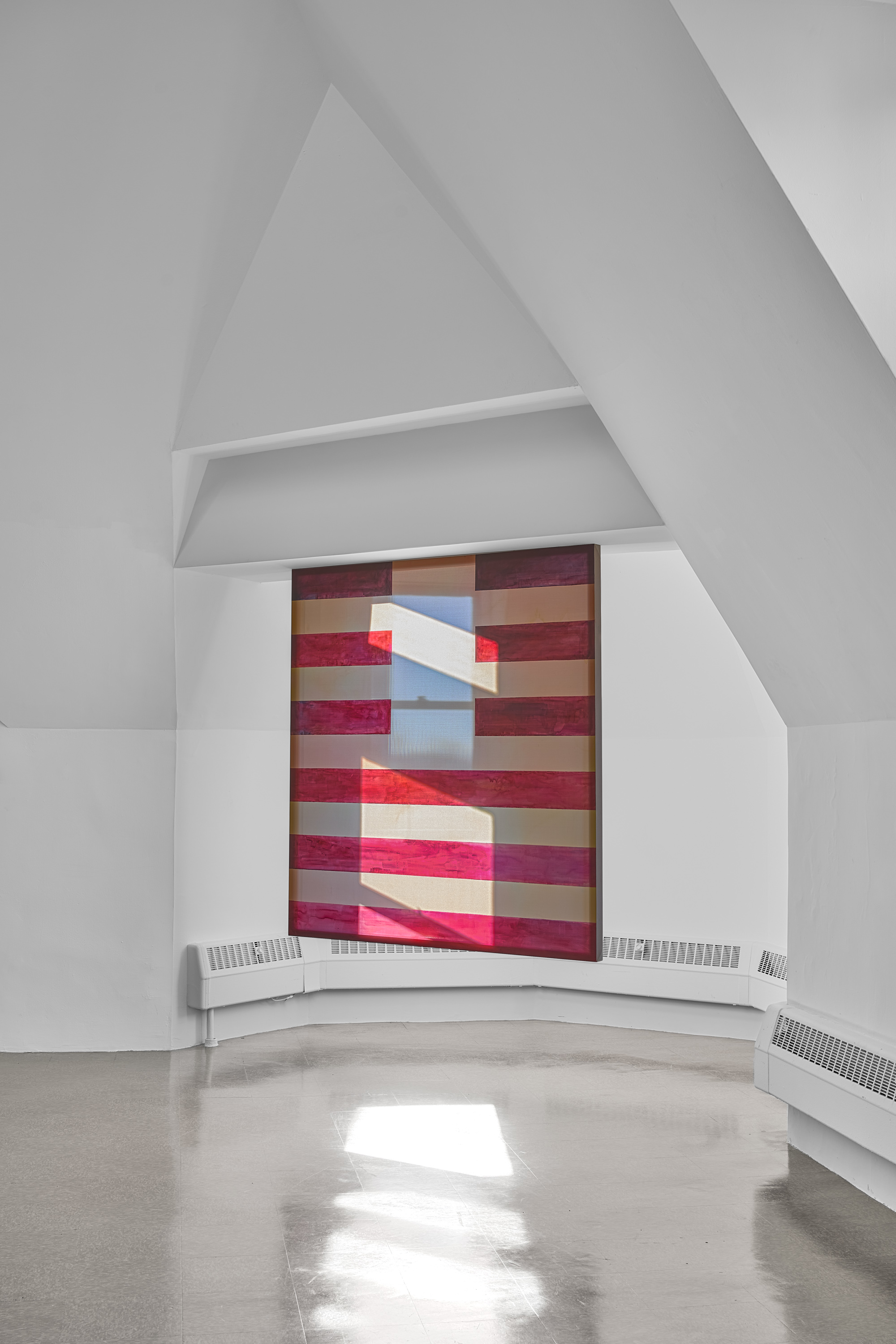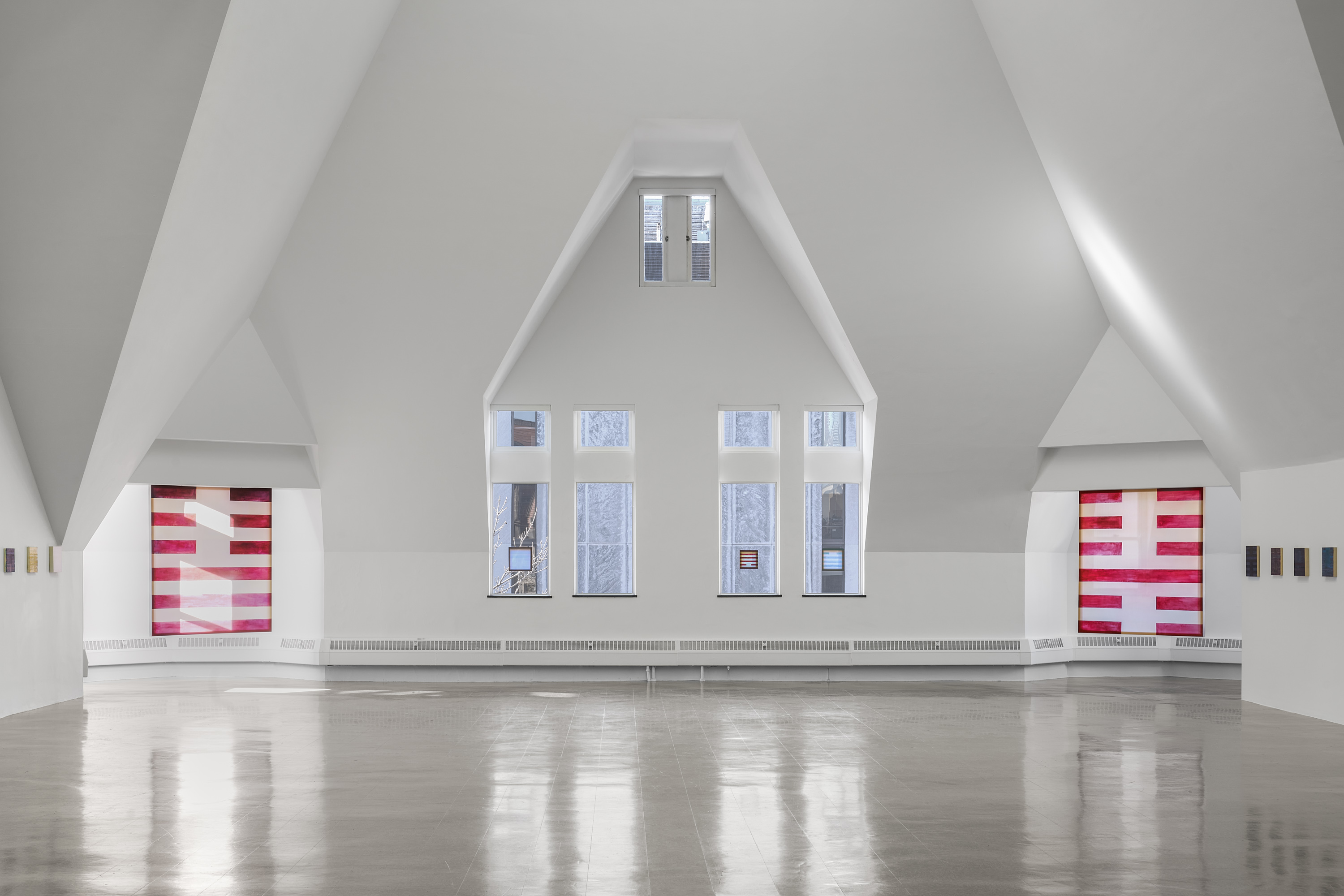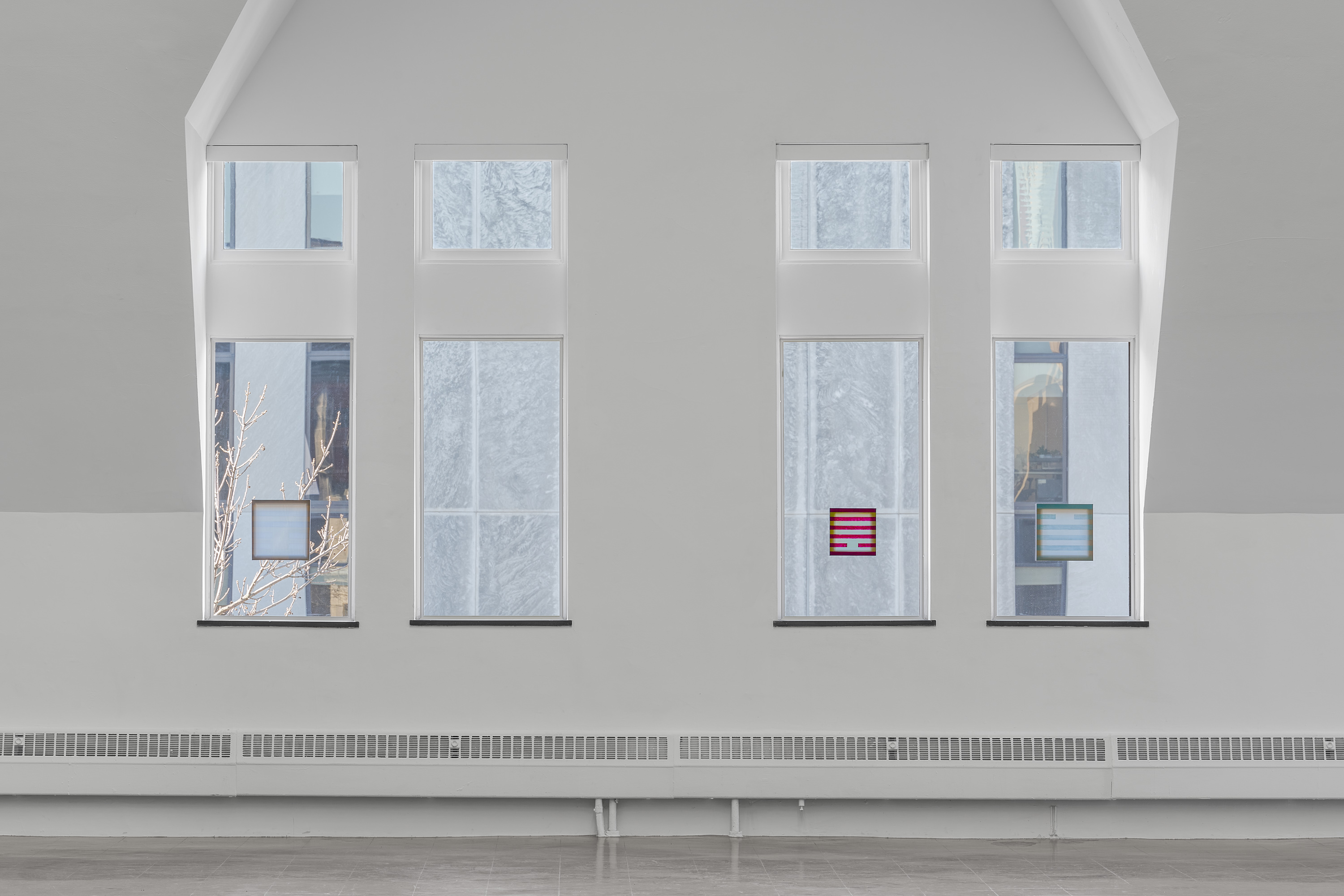 For Change, I Ching (64 Paintings), Zheng has also subtly reshaped the exhibition architecture. The transformation is understated rather than dramatic, but carefully calibrated to heighten the play of light throughout the space, and, at times, to redirect it in dialogue with the paintings. By covering certain windows, adjusting the proportions of select walls, and building a new rhythm around the room’s perimeter, Zheng creates conditions that privilege what she calls “the light of the here and now.” As daylight shifts over the course of the day, the silk paintings shift with it, their surfaces absorbing and reflecting minute changes in color and brightness. In turn, these variations reveal the altered space itself, making the architecture and the paintings co-responsive, changing together in real time.